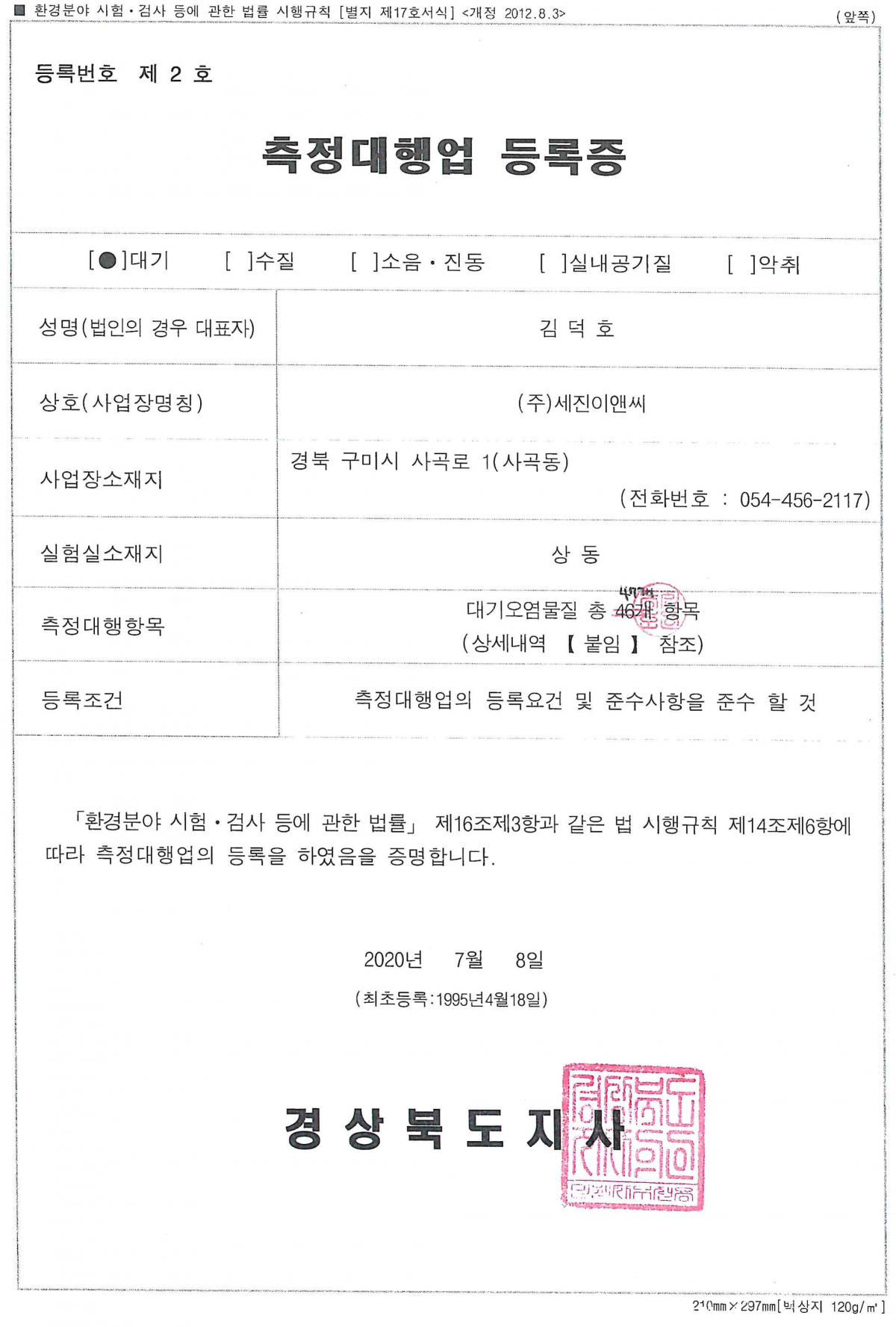 대기 측정대행업 등록증