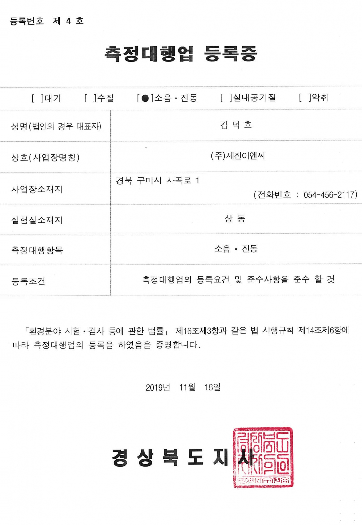 소음•진동 측정대행업 등록증